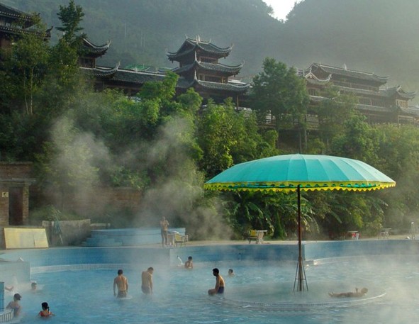 劍河溫泉為國內(nèi)稀有的氡硫溫泉,日涌水量1800 噸,富含氡、硫、鐵、鉀、鈣等元素,其理化指標(biāo)與法國著名的維稀溫泉相似,有消毒、去疾、健膚之功效,常浴可治療和預(yù)防多種疑難病癥,自古享有 “苗鄉(xiāng)圣水” 、“西部浴都”之美譽(yù)。1989年,在這里開發(fā)為現(xiàn)代化的溫泉浴場,里面有一幢內(nèi)設(shè)鴛鴦浴池、桑拿浴池、美容廳的“舒樂”健身房,還有4個露天浴池,其中有為當(dāng)?shù)孛缱逋碛玫穆短煸〕兀线叺氖悄谐?,下邊的為女池,(他)她們至今還保持著原始古樸的裸浴習(xí)慣。裸浴,在(他)她們看來,是一種自然現(xiàn)象,無須顧忌,對偶然出現(xiàn)在浴池邊的外地人,版權(quán)所有山東聊城聊之旅國際旅行社有限公司,轉(zhuǎn)載必究!只要你不是在有意偷看,(他)她們會毫不在意。