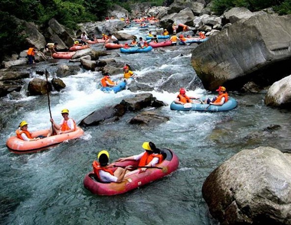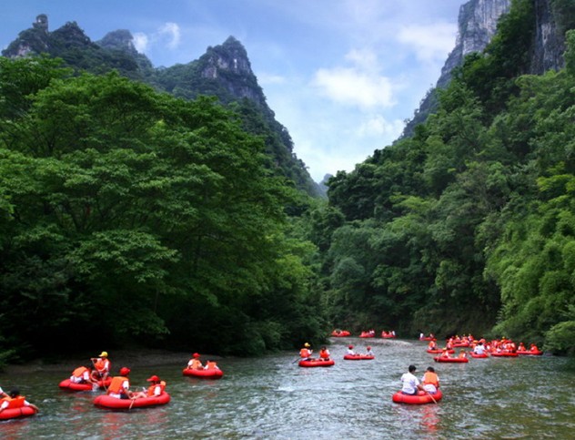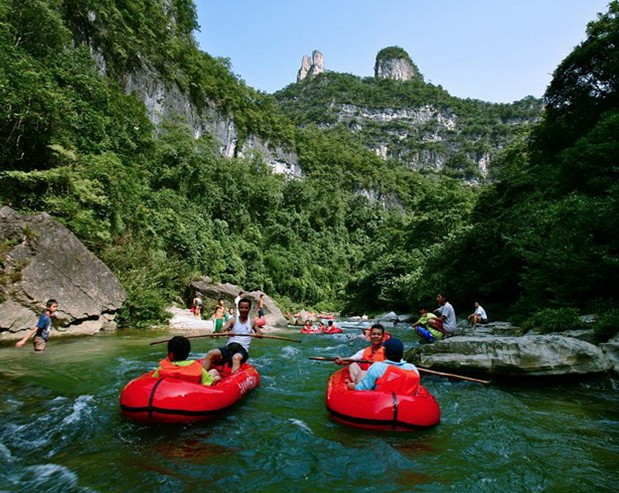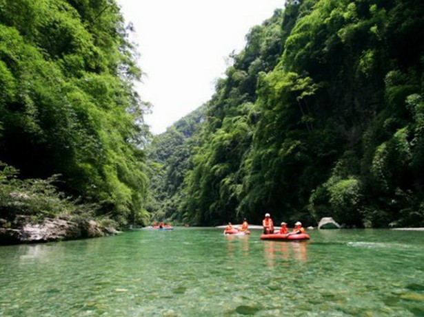 杉木河兩岸,山巖形狀多樣。在杉木河峽谷中漂流的人們便來(lái)了擬物象形的興致,每每見(jiàn)到凌空而架、造型獨(dú)特的一個(gè)天然石拱,學(xué)生物學(xué)的叫它“尺蠖洞”,好老莊的叫它“迎仙洞”,搞地質(zhì)研究的叫它“天生橋”;見(jiàn)到崖畔上陡大的石柱,有航海經(jīng)歷的稱(chēng)其為“林海燈塔”,學(xué)歷史的稱(chēng)其為“烽臺(tái)”??傊?,每一景致都引來(lái)千般說(shuō)道,樂(lè)山樂(lè)水,見(jiàn)仁見(jiàn)智,真?zhèn)€是莫衷一是。杉木河床為卵石細(xì)沙鋪地,流水晶洼碧透,順著寬綽的河道款款流淌。沿途云飄山際,鷺?biāo)奚持?,魚(yú)翔淺底,蟬鳴林梢,奇草溢芳,整個(gè)環(huán)境幽而不險(xiǎn),郁而不閉。倘若有七八十歲的老翁老嫗乘上橡皮舟,只要有船工撐篙定可安然漂流而下;而逞能的姑娘在過(guò)灘時(shí)如被飛濺的浪花嚇得掉入水中,即刻就會(huì)有健壯的手臂向她揮來(lái)——當(dāng)然這并不排除同舟的小伙子惡作劇,創(chuàng)造“英雄救美”機(jī)會(huì)的可能。其實(shí)遇到此種情形即使落下河喝上幾口水也井非壞事,當(dāng)自己掙扎著站穩(wěn)腳跟就會(huì)發(fā)現(xiàn)河水正泠泠地從大腿間流過(guò),瞧那水要多清有多清要多純凈有多純凈,絕無(wú)任何污染。版權(quán)所有山東聊城聊之旅國(guó)際旅行社有限公司,轉(zhuǎn)載必究!何況還會(huì)從虛驚中多了一分體驗(yàn)一分得意,難怪一位游客要戲稱(chēng)“不到浪中翻個(gè)滾,哪知杉水是甜泉”。誰(shuí)要有興趣就停船登岸,到山中采來(lái)竹筍,下水中捕捉魚(yú)蝦螃蟹,搭起帳篷點(diǎn)燃篝火,入夜后伴以流水蛙鳴,舉杯同邀倩風(fēng)明月,享大自然寬厚、質(zhì)樸、醇美的恩賜。這對(duì)于飽受城市喧囂和環(huán)境污染之苦的人來(lái)說(shuō),簡(jiǎn)直是一方勝境。在2009年由《行游天下》雜志社、搜狐旅游、中國(guó)旅游胡同社區(qū)等媒體聯(lián)合推出的“中國(guó)最美旅游勝地排行榜”評(píng)選活動(dòng)中,杉木河漂流入選中國(guó)最驚險(xiǎn)刺激的六大漂流勝地。