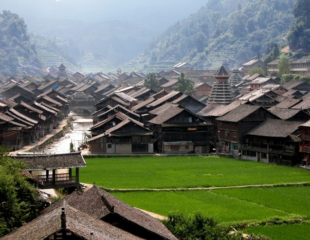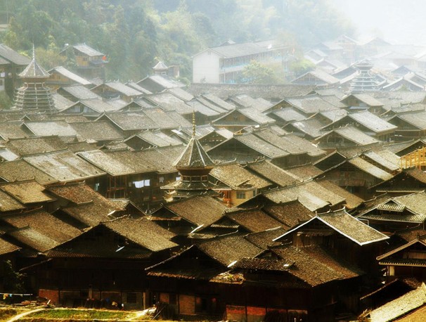 肇興,舊稱[肇洞],位于黎平縣城南70公里,是全國最大的侗寨,有世界最大的侗寨鼓樓群。全寨居住3415人,聚居侗族3125人,全為陸性侗族,分為仁、義、禮、智、信五大房族,各自建有鼓樓、花橋,大小不一,高低不等,風(fēng)格各異,別具匠心。寨子里桿欄式吊腳樓房,鱗次櫛比,疏密有致,全用杉木建造。有眾多的花橋、戲樓、歌坪、禾晾、谷倉、瓢井、侗民居中等建筑,布局緊湊,結(jié)構(gòu)合理。