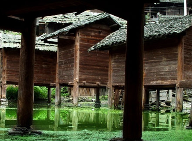 新橋苗寨是性感超短裙苗之鄉(xiāng)。新橋的苗族女人通常穿一種僅長5-7寸的百褶裙,被人戲稱為“超短裙”。具體的穿法是,平時穿兩條裙子,節(jié)日盛裝的時候穿三四條裙子,但不管穿多少裙子,長度總也不會增加;裙子里面穿窄腿長褲或打綁腿,裙子外面罩有花圍腰和花彩帶;上身多是繡花衣、對襟衣,衣服上的刺繡花樣多為蝴蝶花紋。她們的“唐朝發(fā)式”也很有意思。將頭發(fā)梳成大髻,再用大木梳固定聳于頭頂,和唐代壁畫上的仕女非常相似。一走進(jìn)寨子最先注意到的便是這里的“水上糧倉”。為了防火、防老鼠和防螞蟻,保護(hù)糧食,新橋把糧倉都建在寨中的水塘上,一家一戶一座糧倉。