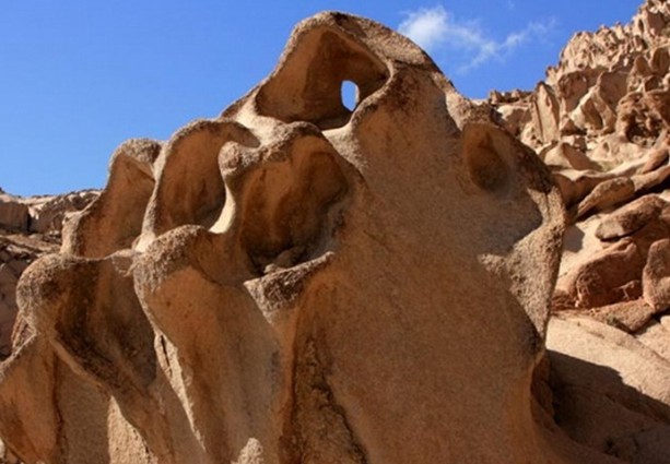 怪石山距巴里坤縣城60公里,有10多公里的便道與縣城至煤礦的柏油公路相接,位于巴里坤湖西北7公里外小夾山的最東端。怪石山最怪的就是滿山的形狀各異的小石窟,幾座山從山頂?shù)缴侥_都是“千瘡百孔”,有的稱“蜂窩崖”,有的稱“千佛洞”或“萬佛龕”、“千窟崖”等。每當(dāng)下暴雨時(shí)水從山頂流下,那山便成了無數(shù)個(gè)小水簾洞,景致令人叫絕!怪石山下就有一眼泉水,是著名的巴里坤八景之一——“鏡泉宿月”的上鏡兒泉所在。