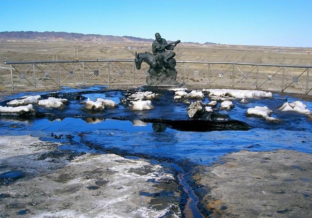 黑油山位于克拉瑪依東北部,距市中心兩公里多,是油田重要油苗露頭的地方,因原油長年外溢結(jié)成一群瀝青丘,最大的一個高13米,面積0.2平方公里,油質(zhì)為珍貴低凝油。"克拉瑪依” 維吾爾語為“黑油”,故這個天然石油瀝青丘且得名黑油山。這座黑色的瀝青山以及它地下埋藏的石油在這里已沉睡上億年。由于地殼變動,巖石產(chǎn)生斷裂破碎,地下石油受地層壓力影響,巖石裂隙不斷向地表滲出,石油中輕質(zhì)部分揮發(fā),剩下稠液同沙土凝結(jié)堆成此黑油山,由于周圍荒涼的惡劣環(huán)境,千百年來它不被人們重視。直到解放前,一位叫塞里木巴依的維吾爾老人,第一次叩響了黑油山大門,他在山旁搭了個地窩子,在集油洼地撈取原油,騎毛驢往返于烏蘇與黑油山間,用黑色的油換取生活用品,當(dāng)?shù)厝擞么嗽忘c燈,膏車軸等。為發(fā)揚艱苦創(chuàng)業(yè)精神,版權(quán)所有山東聊城聊之旅國際旅行社有限公司,轉(zhuǎn)載必究!新疆石油管理局和克拉瑪依市1982年10月1日在黑油山樹立了近3米高的石雕紀(jì)念碑和一尊維吾爾老人騎著毛驢彈奏熱瓦普的塑像。1983年建成從礦史陳列館通往黑油山的瀝青混凝土公路及停車場,到達山頂?shù)氖A也建成。 黑油山已成為各族人民進行革命傳統(tǒng)教育的紀(jì)念地和游覽勝地。