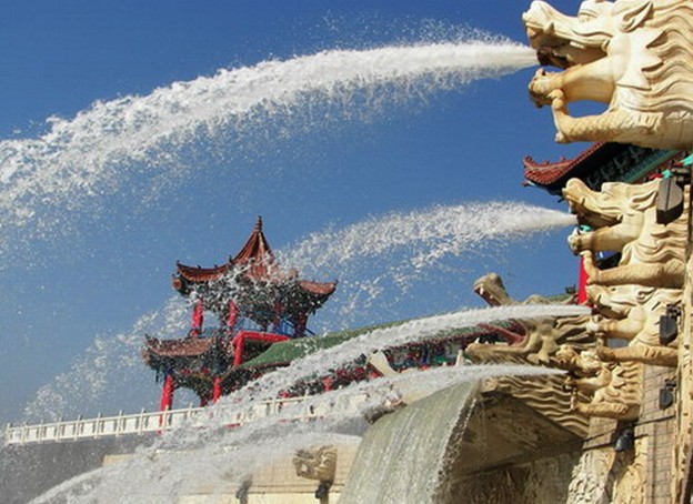 九龍?zhí)妒强死斠篮拥脑搭^所在,地處克拉瑪依河穿城風景帶之首—東郊瀑布景區(qū)內。該景區(qū)主要由高約8米的人工瀑布、瀑布下的巨潭和周圍大面積的綠化林帶草坪構成。瀑布水源來自風克干渠湍急的水流從中間的一條巨龍口中噴出,利用水的噴涌速度和自然重力形成寬約10米的巨大的瀑布,瀑布的兩邊分列的8條龍嘴也同時噴出水柱,構成一副巨大的水廊。