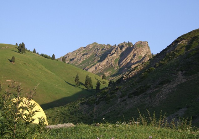 從烏魯木齊出發(fā),抵達(dá)大河沿后,租用越野車或卡車至五星牧場(chǎng)扎營。這里就是徒步的起點(diǎn)。