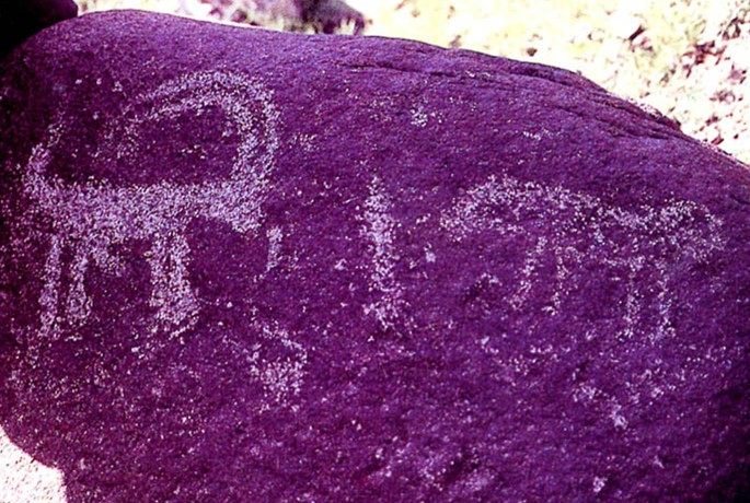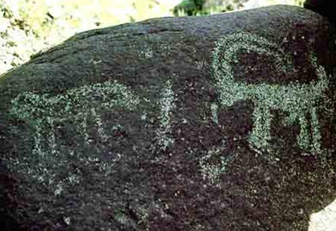 克爾堿巖畫位于托克遜縣庫加依鎮(zhèn)境內,南距鎮(zhèn)政府約4.5千米,巖畫散布在鎮(zhèn)北的克爾堿 溝兩岸,畫面內容主要有:羊、牧羊人、鹿、狗、駱駝以及狩獵、放牧等場面。其中一幅水系圖令人注目。巖畫基巖均為侏羅紀粗砂巖。相傳有位神匠途經此地,眼見四周環(huán)境優(yōu)美,于是整日靜坐在河岸欣賞,后將四周景色逐一刻畫于巖壁上,形成人們今天看到的巖畫。