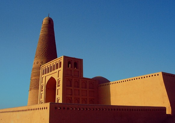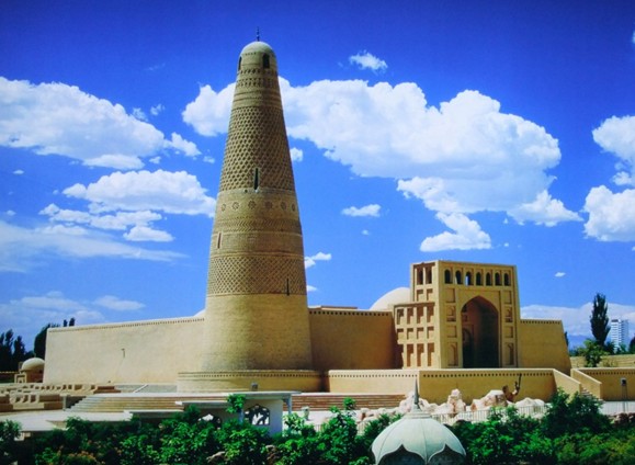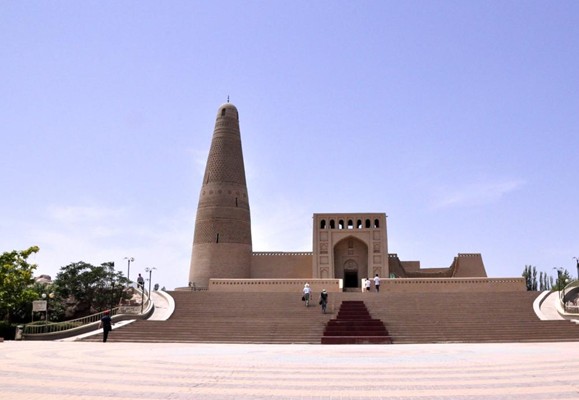 蘇公塔位于吐魯番市東郊2公里處的葡萄鄉(xiāng)木納爾村,是一座造型新穎別致的伊斯蘭教塔。蘇公塔是新疆境內現(xiàn)存最大的古塔,建成于公元1778年,迄今已有230 多年的歷史,它是清朝名將吐魯番郡王額敏和卓,為了恭報清王朝的恩遇,表達自己對真主的虔誠,并使自己一生的業(yè)績流芳后世,而自出白銀7000兩建造。