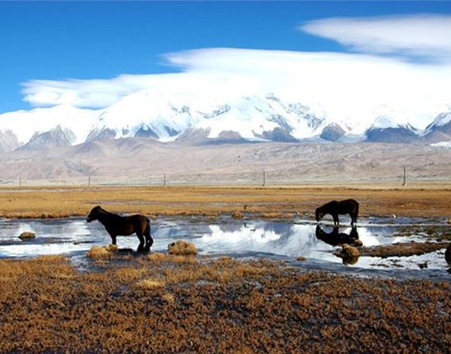 和田河是唯一從塔克拉瑪干沙漠腹地穿過的河流,全長1127公里,其上游由兩條支流構成,一條是玉龍喀什河,一條是喀拉喀什河,均發(fā)源于昆侖山,兩河在闊什拉什匯合后始稱和田河,和田河下游為典型的平原游蕩型河流,河床寬淺,河流曲折婉蜒,多心灘、邊灘,以灰楊、胡楊為主的天然林沿河兩岸呈帶狀分布,野生動物時常出沒。