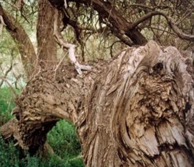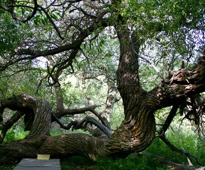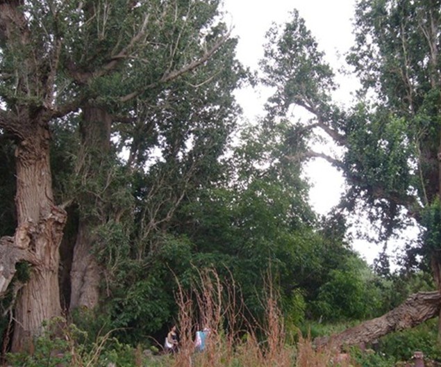 阿克蘇向北,過溫宿縣城后,再向西北行60公里,穿越一大片戈壁灘,一個(gè)崗巒起伏的小綠洲便展現(xiàn)面前。這個(gè)小綠洲,不是處在地勢低洼處,而是位于坡度平緩的崗阜上,海拔為1700米左右,面積僅0.4平方公里,但卻是郁郁蔥蔥,濃蔭覆蓋,流水潺潺,蜂飛蝶舞,堪稱人間仙景。當(dāng)?shù)胤Q它為“怪樹園”。被稱之為“圣水泉”的一汪清泉在綠洲頂部,涓涓細(xì)流,滋潤著這塊綠洲。