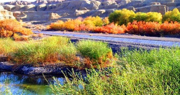 水流兩側(cè)是茂密的胡楊林,主要樹種有胡楊、銀灰楊、毛柳、尖果沙棗,灌木有鈴鐺刺、薔薇、柳。白刺等,草類繁多,多為禾本科和豆科屬種。胡楊是新疆古老和珍奇的樹種之一,是荒漠中河岸林的優(yōu)勢樹種,具有抗干旱、御風(fēng)沙、耐鹽堿的能力,樹型與一般楊樹的大不一樣,樹干粗壯而多分支,樹葉有柳葉型和橢圓型兩種,樹冠寬圓,成年的胡楊給人以蒼勁挺拔的感覺。