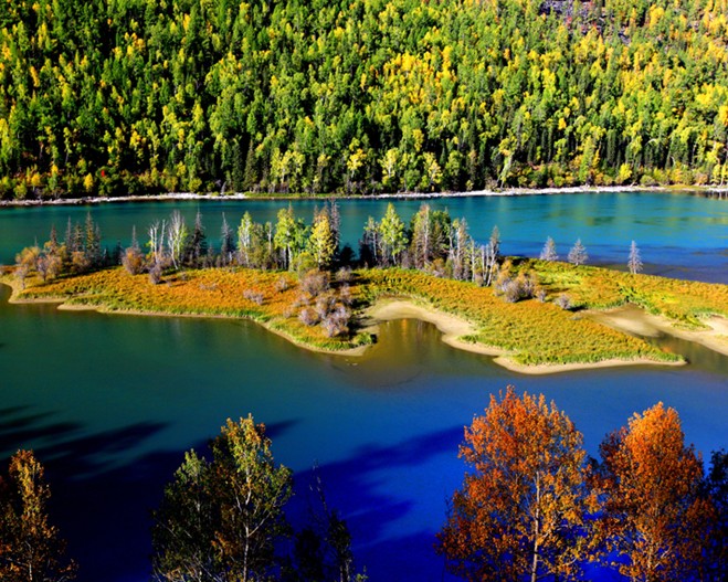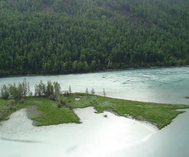 喀納斯河河水從河灣的西北角流入臥龍灣,進(jìn)水處巨石抵中流,激浪拍巨石,玉珠飛濺。由于河灣開闊,河流在此流速減緩,水面微波浮動(dòng),碧藍(lán)潔凈,清澈透明,熠熠閃光。湖四周森林茂密,繁花似錦,綠草如茵,湖中小島景色秀麗。湖的泄水口有座木橋飛架東西,站在橋上向北是一平如鏡的臥龍灣,向南是奔騰咆哮的喀納斯河。灣內(nèi)的湖心島猶于一條巨大的臥龍。