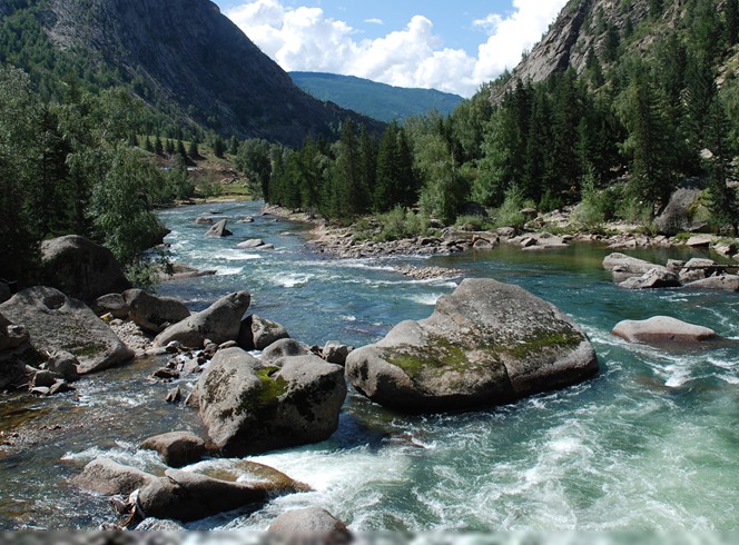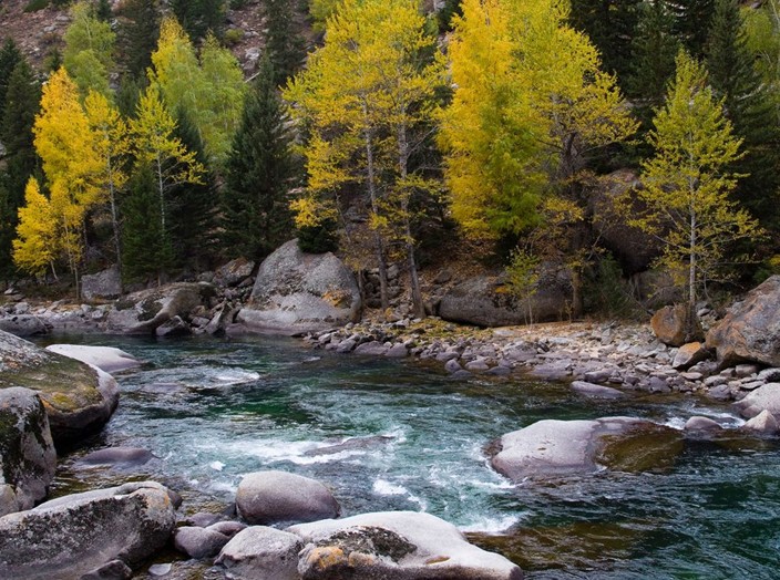 溫泉上游約100米處,有一飛瀑從巨石上直瀉而下,與奔騰的額爾齊斯河構(gòu)成一幅立體圖畫,瀑底海拔1459米,屬常年性流水瀑布,由崩落的花崗巖巨石堵塞卡拉卓勒溝谷,流水翻越巨石而形成。瀑布主體分為二級,上級高8米,下級高12米。從此處過橋,再往上走,河谷越來越窄,水流越來越湍急,森林越來越茂密,山路越來越艱險(xiǎn)。僅在兩河交匯處的三岔河口,地勢相對開闊,綠草如茵,古松如塔。