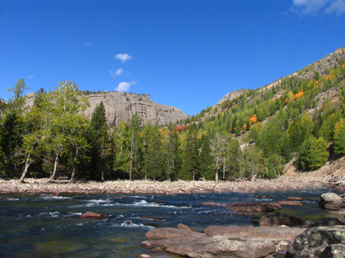 到了秋天,大東溝好比一個(gè)色彩繽紛的魔術(shù)師,金燦燦的白樺樹,紅艷艷的楊樹,深綠色的青松,重重疊疊,層林盡染,陪伴著湍流不息的額爾齊斯河水,不時(shí)傳來啄木鳥、布谷鳥、杜鵑鳥清脆的鳴叫聲。