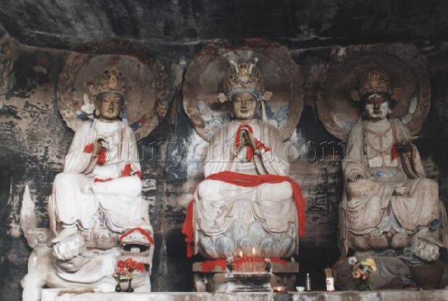 三壁三龕佛殿窟: 有南三、五、七、北三。窟分前廊后室(南七、北三)面闊為三間四柱,明間正中開窟門,次間各開大龕,龕內(nèi)雕踏山力士像,明間上部為印度式拱,次間額枋上為一斗三升拱。版權(quán)所有山東聊城聊之旅國際旅行社有限公司,轉(zhuǎn)載必究窟檐雕出仿木結(jié)構(gòu)建筑形式的滴水、圓椽、筒瓦等,瓦垅上有八層疊澀基,基上浮雕大型山花蕉葉覆蓋窟頂,大蕉葉擁托覆缽丘,丘上雕出象征塔剎的雙層火焰寶珠。窟內(nèi)平面方形、穹隆頂,正、左、右壁各開帷幕帳形龕,龕內(nèi)雕一鋪三尊(南五)、五尊(南七)、七尊(北三)像,窟頂浮雕蓮花藻井及飛天伎樂,地面浮雕大蓮花,蓮花中間置博山爐(南五)窟門兩側(cè)刻大番卷草紋和連珠紋,上部刻飛天。