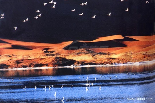 這里群沙懷抱,沙峰林立、起伏錯落、一望無垠,金燦燦、亮閃閃,如大海波濤從四周漫卷而來,卻突然如著了魔法一般被茵茵綠草、汪汪湖泊鎖定,形成了方圓近百里的沙漠濕地草原。在茫茫無涯的翰海中,這不能不說不是一個奇跡!況且這里還是古絲綢之路北路要塞,古商道、古鹽道、大盛魁古駝道……;還有古長城、古戰(zhàn)場、古買賣城遺址,流傳千古的故事和傳說以及世世代代在馬背上繁衍生長、與草原休戚與共的沙漠牧民,因此,被譽為“大漠中的伊甸園”名副其實。