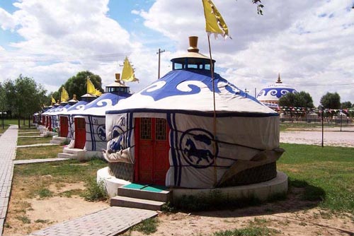 四、賽馬、摔跤、射箭場:從餐飲住宿部向東南行走500米,到蒙古族娛樂活動(dòng)的中心,賽馬場,每年的那達(dá)慕大會(huì)就在這里召開。在高天的主席臺兩側(cè),排列著階梯形的觀禮臺。周長兩公里的封閉式賽馬道開闊平坦。騎手們穿著五彩繽紛的民族服裝,在賽道上飛奔,游人們情不自禁的跨上駿馬加入到賽馬的行列,一表騎馬風(fēng)采。