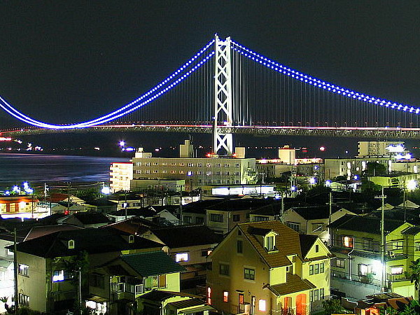 明石海峽大橋:連接本州島和淡路島的明石大橋,于1998年4月開通,全長3,911米,是世界上最長的吊橋。夜晚時(shí)候開起燈火,整座大橋猶如珍珠裝飾,故有“珍珠大橋”的美稱。燈光的開放十分講究,平日開四季之顏色的燈,周末與節(jié)日開藍(lán)綠色的燈。舉辦活動(dòng)時(shí),燈光顏色會(huì)不斷變化。報(bào)時(shí)的時(shí)候,整點(diǎn)是彩虹色、半點(diǎn)是寶石色。