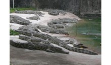 在白藤湖內(nèi)尖峰橋湖心路口即可望到鱷魚島那金碧輝煌,巍峨壯麗的泰式門樓,門前寬廣的停車場可一次性停放上百輛大巴,進入大門后,有一個十分醒目、高達4米的大型鱷魚雕像——“鱷魚一家”吸收不少游客紛紛在此攝影留念,離雕像百米處,十多個鱷魚池座落在鮮花叢中、綠茵地上、池中養(yǎng)有我們祖先稱為“噴火龍”、“鮫龍”的楊子鱷、泰國灣鱷、馬來鱷、雜交鱷等四個品種,大小近千條,最小的有剛出殼的幼鱷,體型最大的有4米多長,重達千斤。