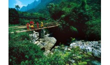 神農(nóng)溪,發(fā)源于神農(nóng)架主峰,流經(jīng)湖北巴東縣境內(nèi),由北向南穿行于深山峽谷之中,至巫峽口東匯入長(zhǎng)江。神農(nóng)溪是一條典型的峽谷溪流,兩岸山峰緊束,絕壁峭聳,溪水在刀削般的峽壁間沖撞,水道曲折,湍急的溪流中有險(xiǎn)灘、長(zhǎng)灘、彎灘、淺灘六十余處。水道雖狹急卻清淺,漂流極富刺激而又安全。