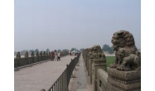 盧溝橋(Lugou Bridge)亦作蘆溝橋,在北京市西南約15千米處豐臺(tái)區(qū)永定河上。因橫跨盧溝河(即永定河)而得名,是北京市現(xiàn)存最古老的石造聯(lián)拱橋。盧溝橋全長(zhǎng)266.5米,寬7.5米,最寬處可達(dá)9.3米。有橋墩十座,共11個(gè)橋孔,整個(gè)橋身都是石體結(jié)構(gòu),關(guān)鍵部位均有銀錠鐵榫連接,為華北最長(zhǎng)的古代石橋。