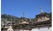 卡瑪多塔林位于類烏齊縣國道317線右側,距縣城25公里。塔林依山位傍水、風景秀麗、古木參天、蒼松翠柏、四季常青。在蔥郁翠柏中有一座別致的小經堂,主供蓮花生大師像,左右各豎有幾根高大的轉經筒。傳說,過去這兒有108個塔,現(xiàn)已恢復和修建的塔有幾十座。其造型各異,別具一格,既有要求嚴格的八佛塔,也有方形怪塔;既有幾米高的大塔,也有不到三米的小塔。