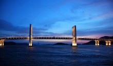 澳門“友誼大橋”,工程原稱新澳氹大橋,1994年初建成通車。位于舊大橋(嘉樂(lè)庇總督大橋)以東,連接澳門半島新口岸水塘北角(外港碼頭處)與氹仔北安碼頭。橋?qū)?5米,設(shè)兩條雙線車道,中設(shè)分隔線,車道兩旁設(shè)1.5米寬的行人道。