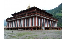 查杰瑪大殿即類(lèi)烏齊寺大殿,為類(lèi)齊烏寺主體建筑,也是齊烏寺最著名的景觀。大殿面積為3334平方米,大殿分為花殿、紅殿和白殿,共三層,另加大金頂,高度為48.5米,豎立大小柱子180根,其中64根大柱高約9米,需2人合抱。