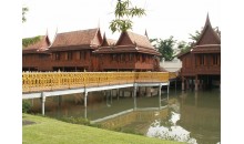 行宮內(nèi)全部采用柚木所建成的,大片綠色草坪上的柚木行宮,建筑風(fēng)格很明顯受到歐洲的影響,但基本是還是根據(jù)泰國的傳說來興建的。它使用了金色的柚木,卻沒有一根釘子在上面。柚木里有特別的油脂,而使得它能抗熱和大雨,再加上這種油脂本身還有驅(qū)去蟲的功能,更使它成為價(jià)值不斐的建筑良材。