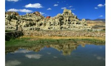 覺囊寺坐落在日喀則拉孜縣歐布瓊山山腰處,海拔4600米。始建于公元十二世紀(jì),由貢巴?土杰尊珠主持修建。該寺曾有二萬多名僧人,在歐布瓊山上有二千多處修行洞和坐禪房,并修建了一座“萬佛一見得解塔”,塔高約27米,塔型呈“時輪壇城”,有108個門、108個殿堂。主供佛為喜繞堅贊師徒三尊佛。每年藏歷4月15日,該寺舉行“時轉(zhuǎn)跳神”活動。