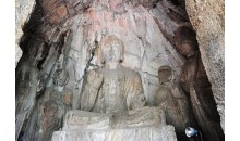 潛溪寺高、寬各九米多,進(jìn)深近七米,大約建于一千三百多年前的唐代初期。窟頂藻井為一朵淺刻大蓮花。主佛阿彌陀佛端坐在須彌臺(tái)上,面頤豐滿,胸部隆起,衣紋斜垂座前,身體各部比例勻稱,神情睿智,整個(gè)姿態(tài)給人以靜穆慈祥之感。主佛左側(cè)為大弟子迦葉,右側(cè)為小弟子阿難。兩弟子旁邊分別為觀世音菩薩與大勢(shì)至菩薩。特別是南壁的大勢(shì)至菩薩,造型豐滿敦厚,儀態(tài)文靜,在故宮博物院有1比1的復(fù)制品陳列。阿彌陀佛與兩側(cè)的兩位菩薩共稱為西方三圣,即掌管西方極樂世界的三位圣人,是佛教凈土宗信仰的對(duì)象
