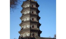 七級浮屠塔 高約37米,布局為國內(nèi)罕見,正面朝南,緊連磚建硬山式地藏殿。殿前接三間卷棚敞廳,東西兩側(cè)各設(shè)兩層塔式鐘鼓樓。塔東、南、西三面和北面三層以上開窗,余皆在外設(shè)拱形佛龕,塑以生動的羅漢浮雕31尊。殿塔相通,供奉三大佛、四菩薩七尊銅像。 塔內(nèi)有木梯,可供登臨觀賞。殿和塔檐下的雀替做成龍、鳳、獅、鶴等浮雕,造型生動。塔的局部構(gòu)件和裝飾具有西方建筑的風格。